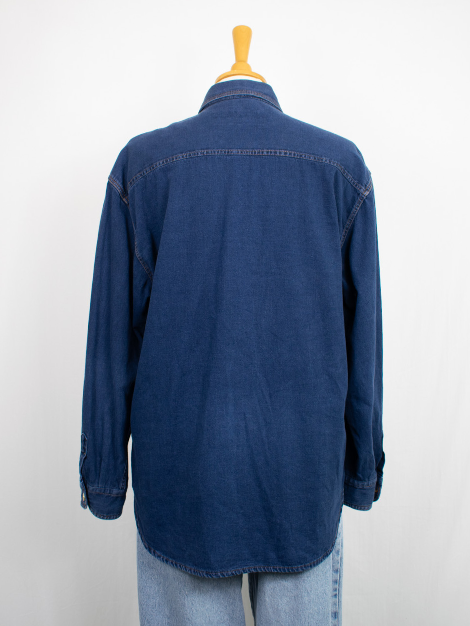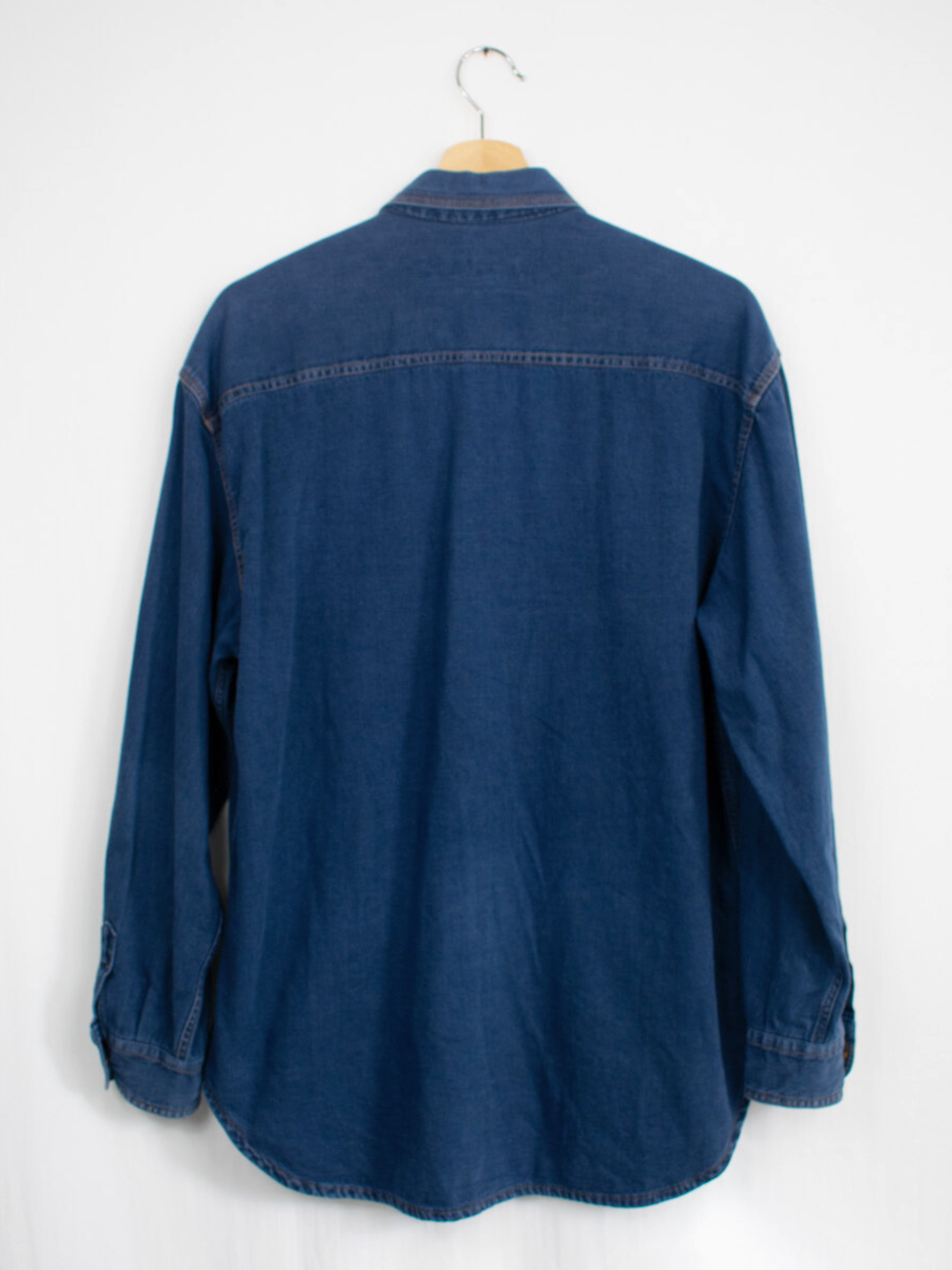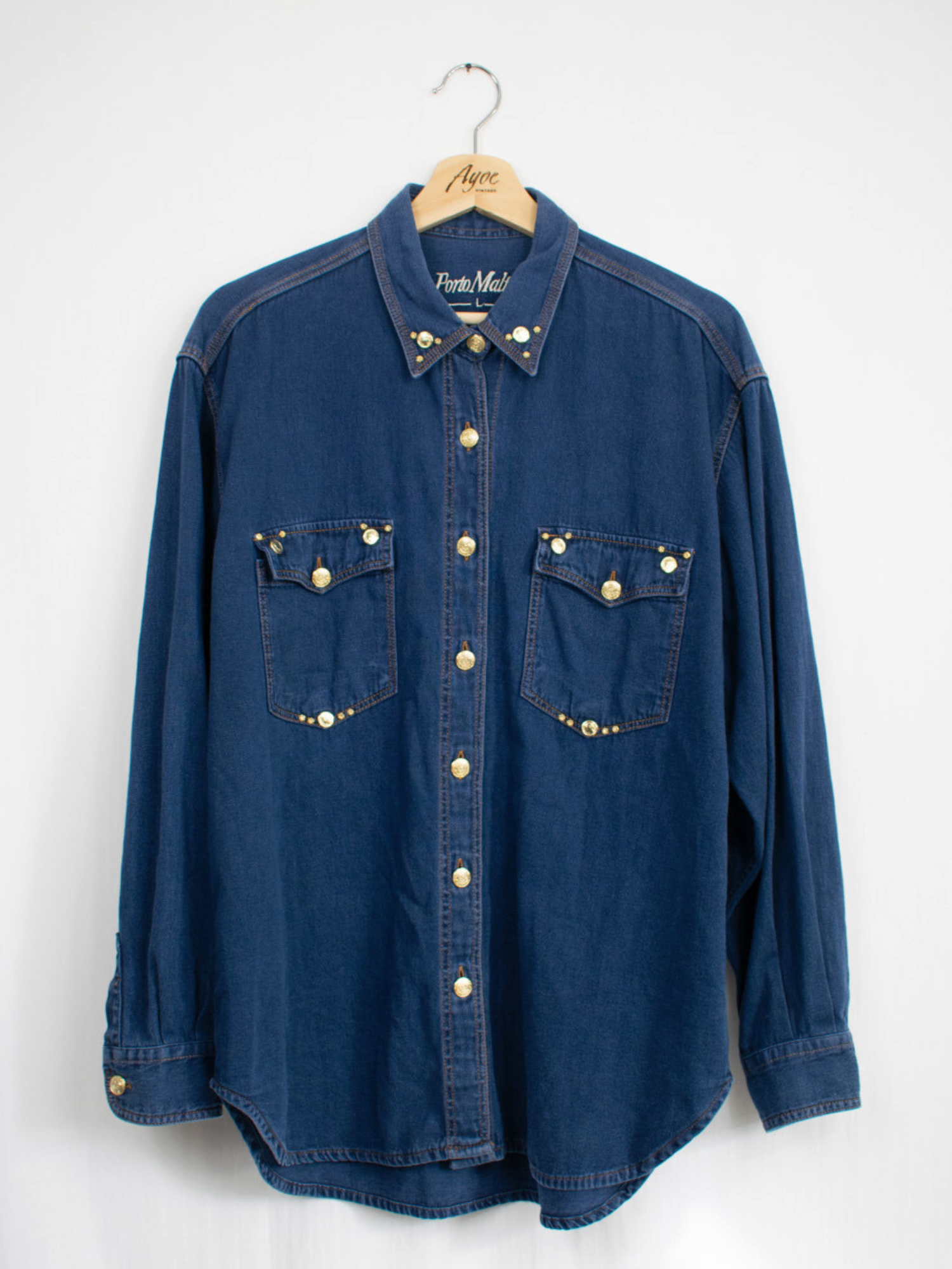 Denne navy blå denim skjorte er med langt ærme, den har guld knapper og fine små guld detaljer med guld hardware.