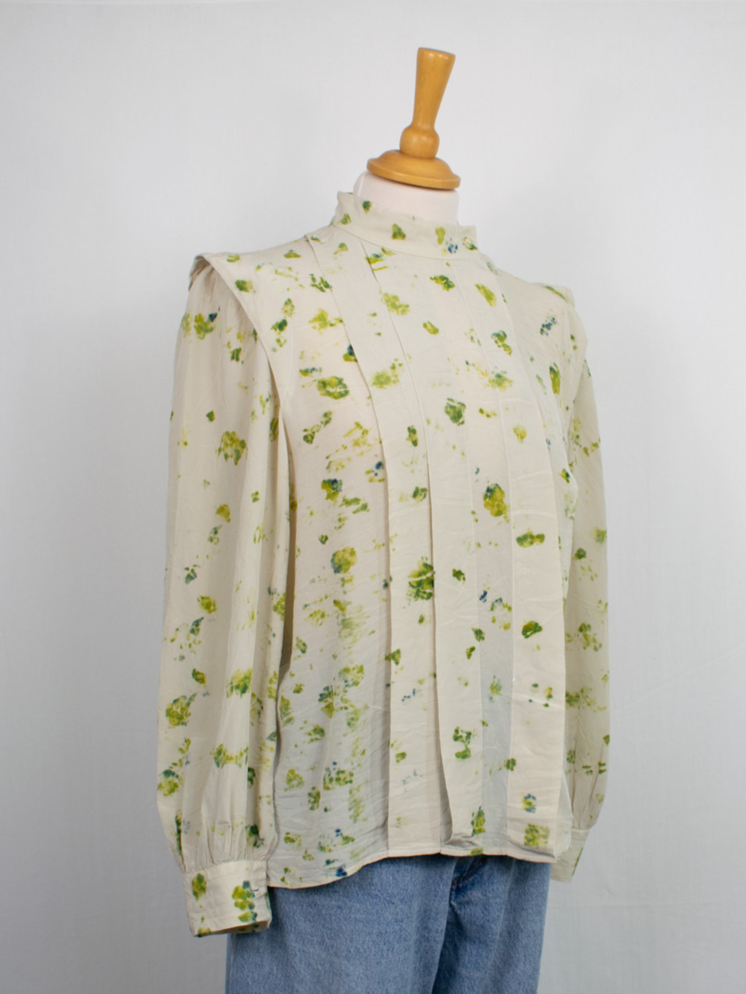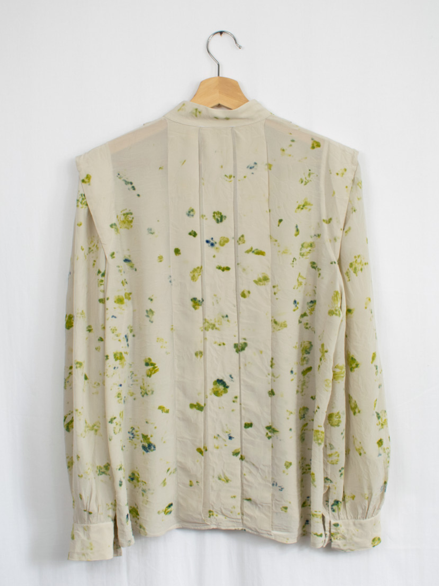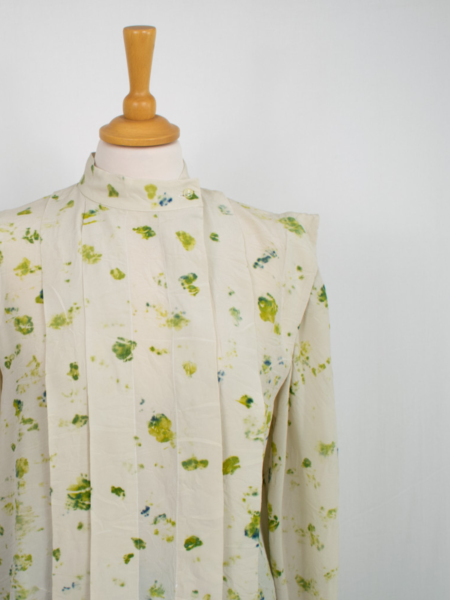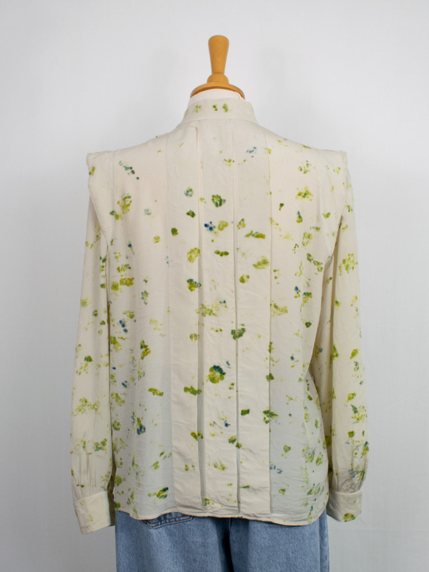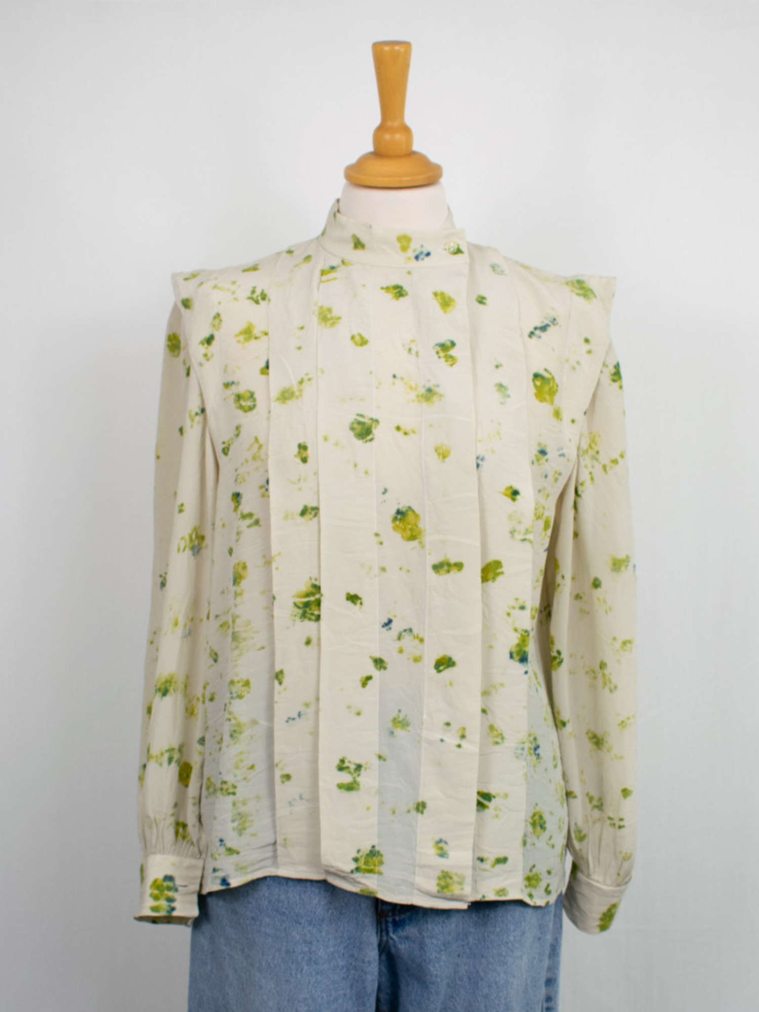 Skjorten er håndfarvet med blomster plukket lokalt i Stenbjerg og Thy.