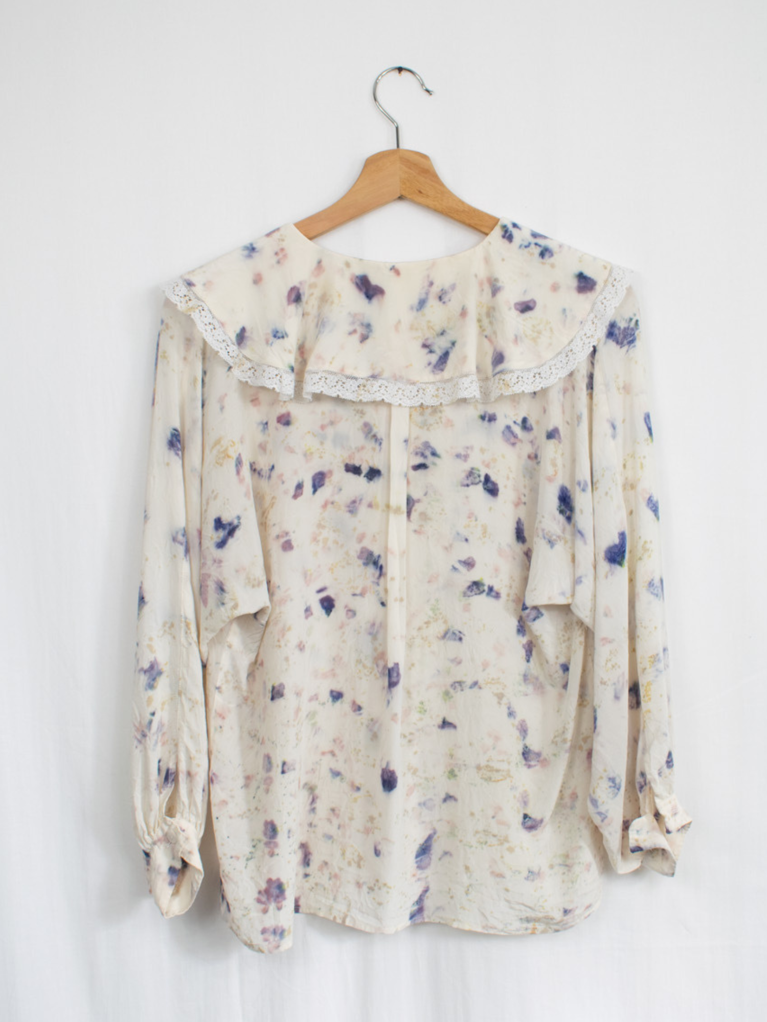 Skjorten er håndfarvet med blomster plukket lokalt i Stenbjerg og Thy.