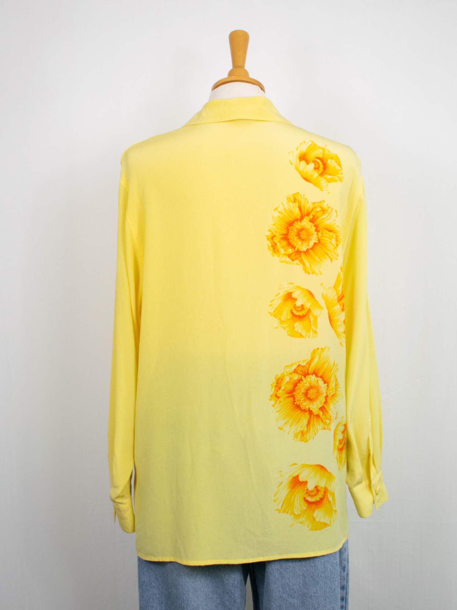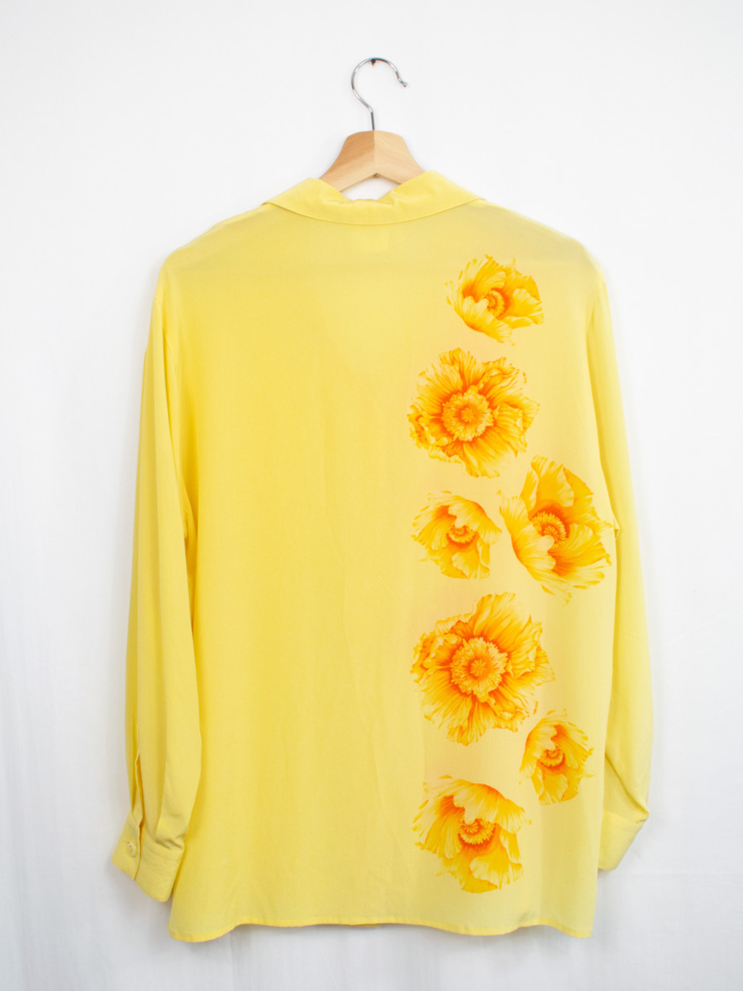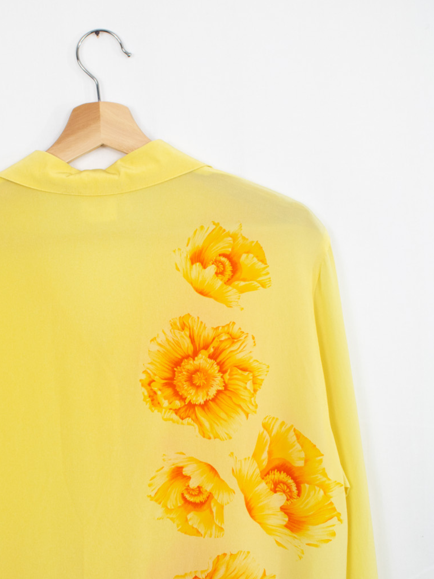 Denne smukke silke skjorte er med langt ærme, den er i let fint silke og falder flot, har et smukt print af orange valmuer på for- og bagside.