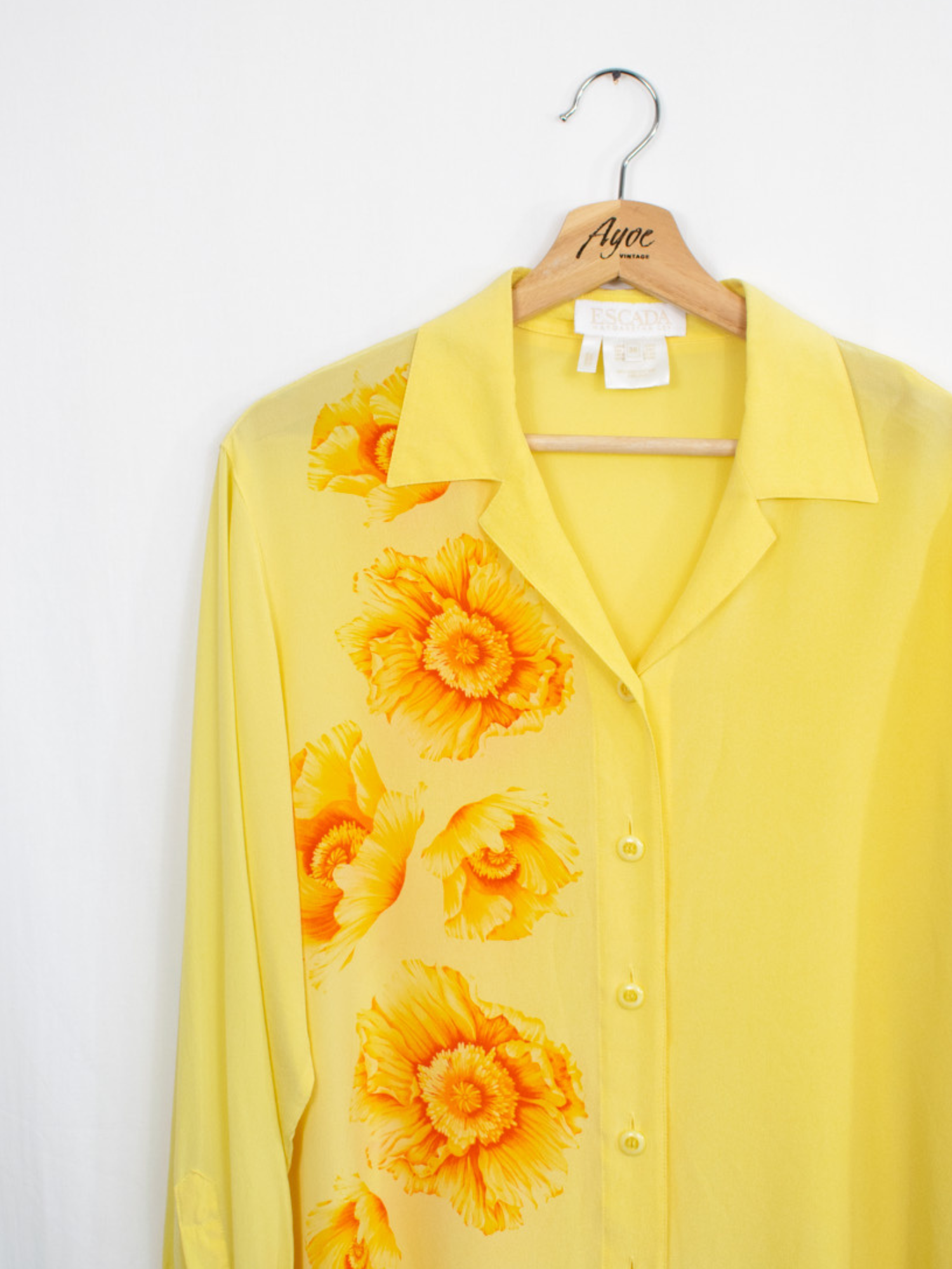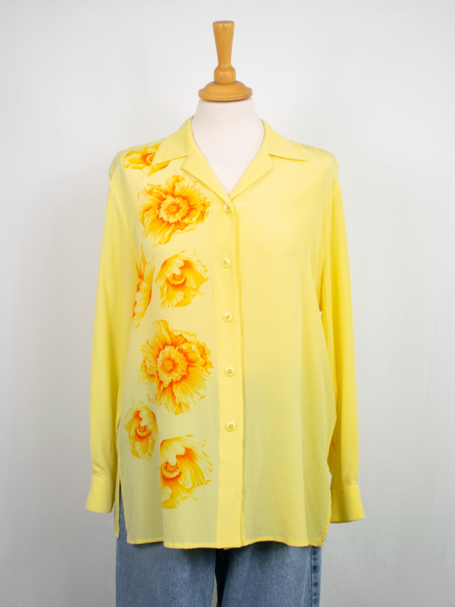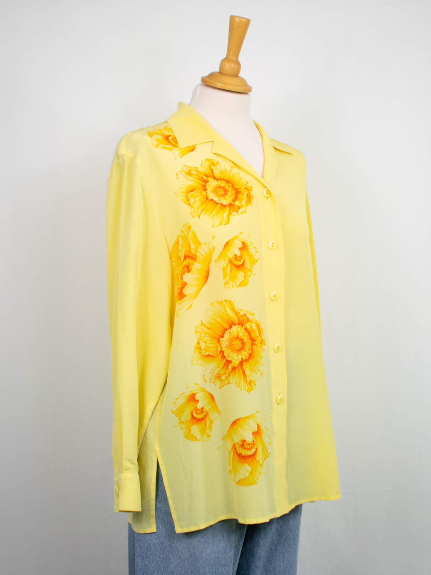 Denne smukke silke skjorte er med langt ærme, den er i let fint silke og falder flot, har et smukt print af orange valmuer på for- og bagside.
