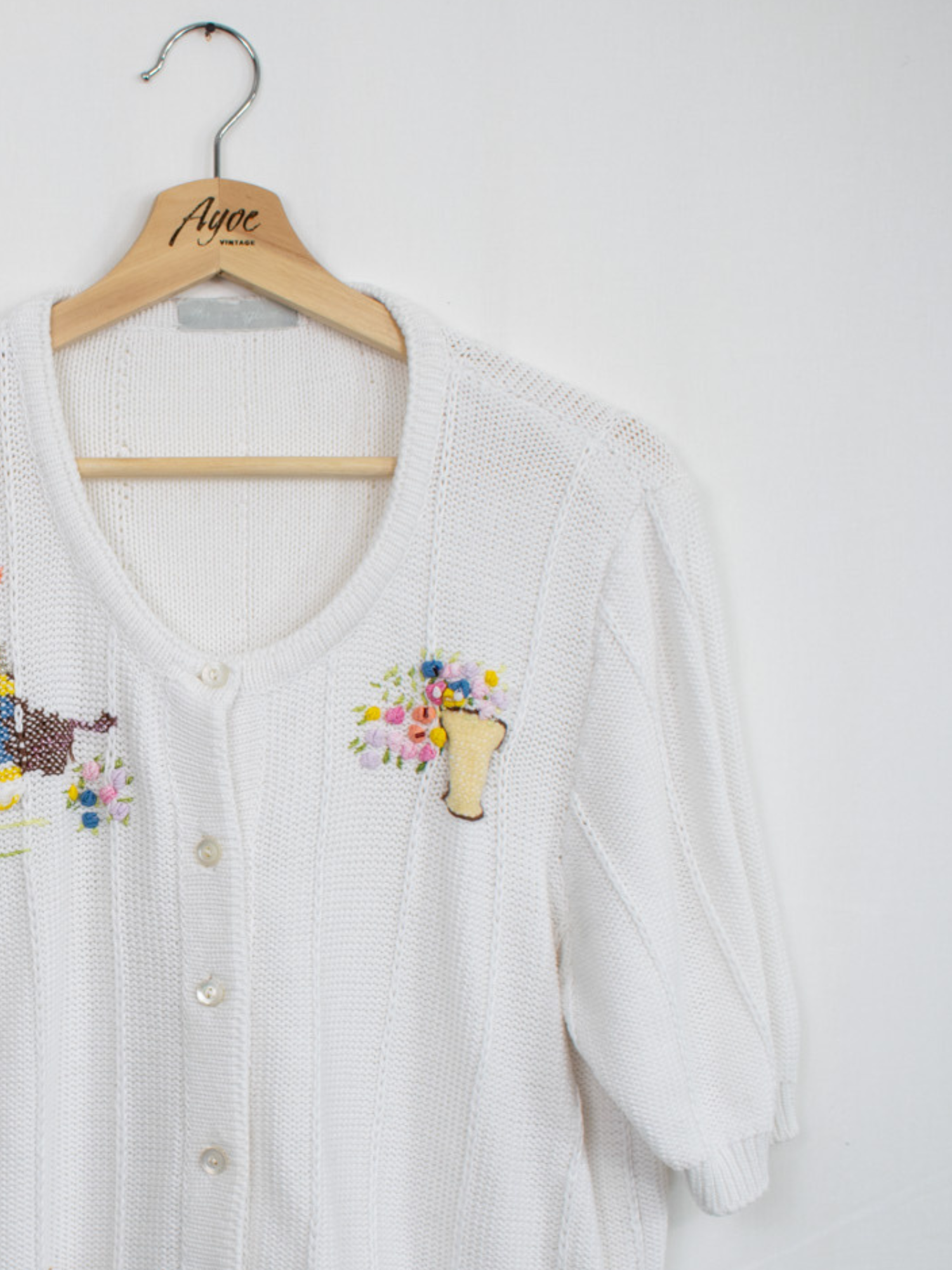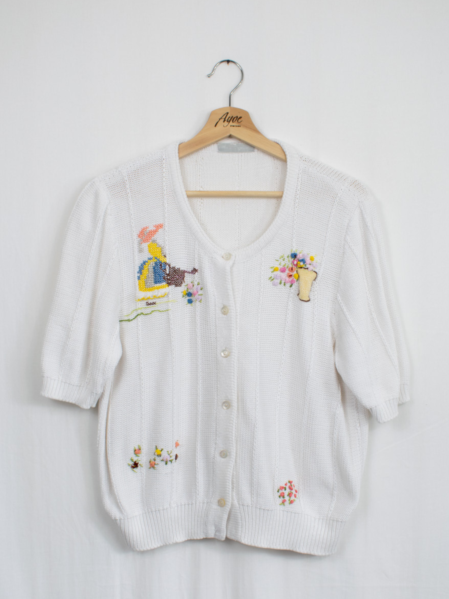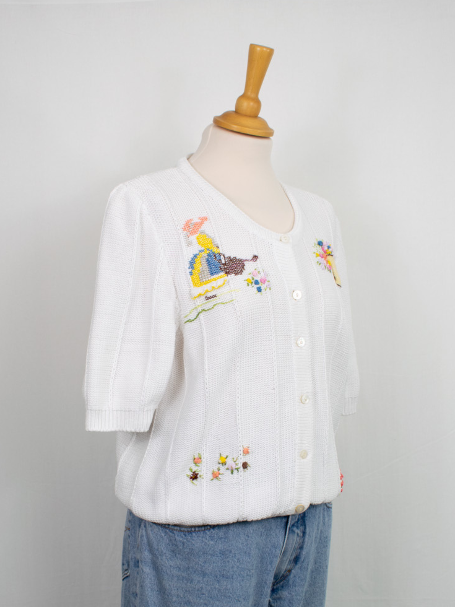 Denne fine cardigan er med kort ærme, den har smukke detaljer af broderi i pastel farver.