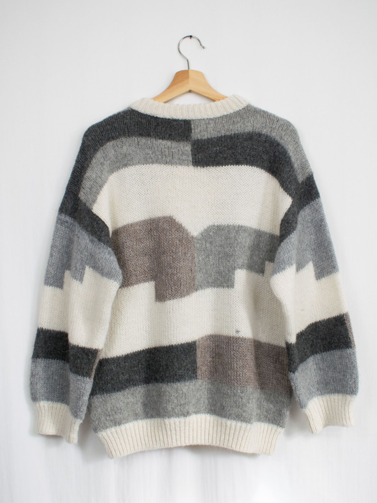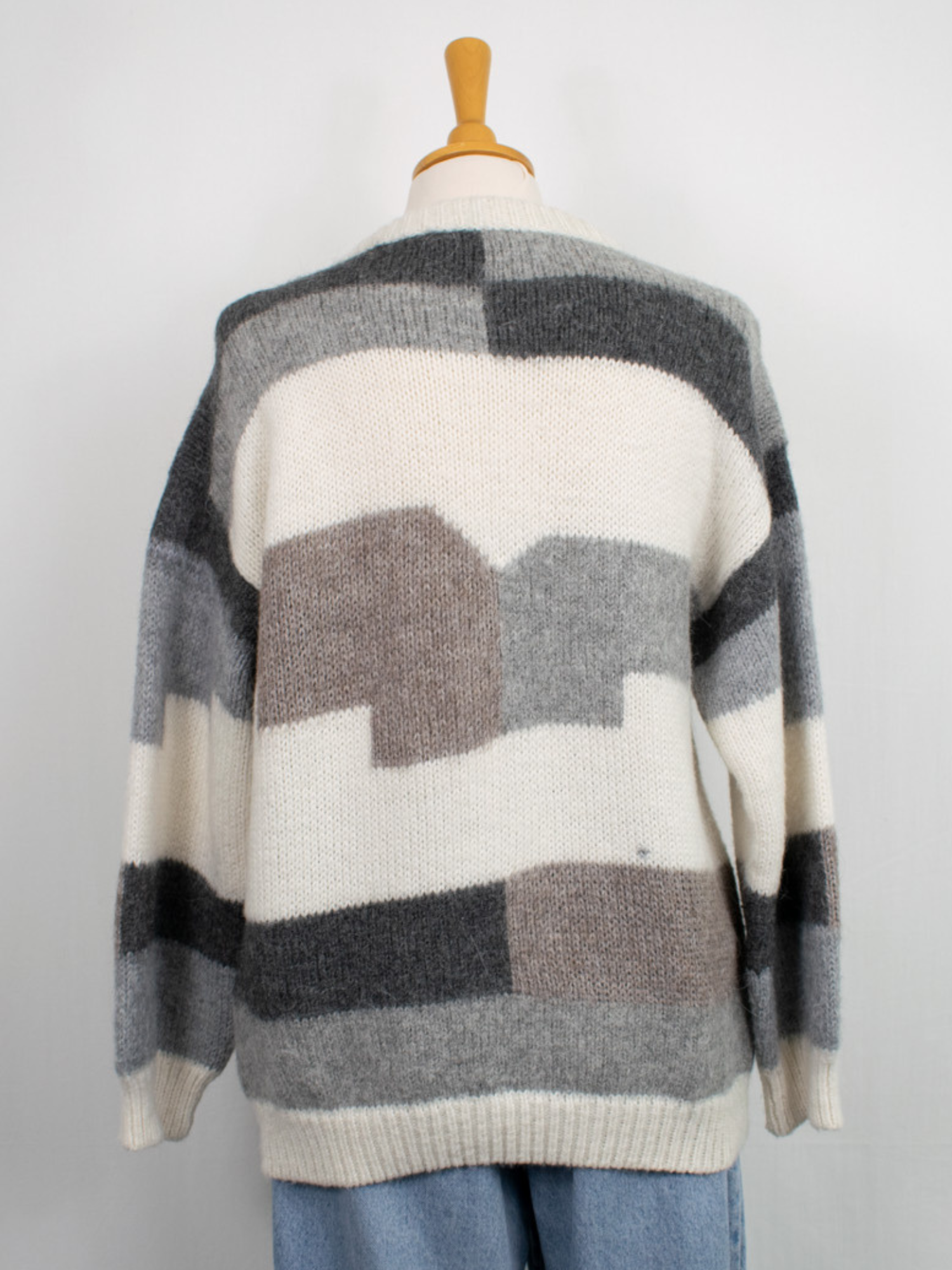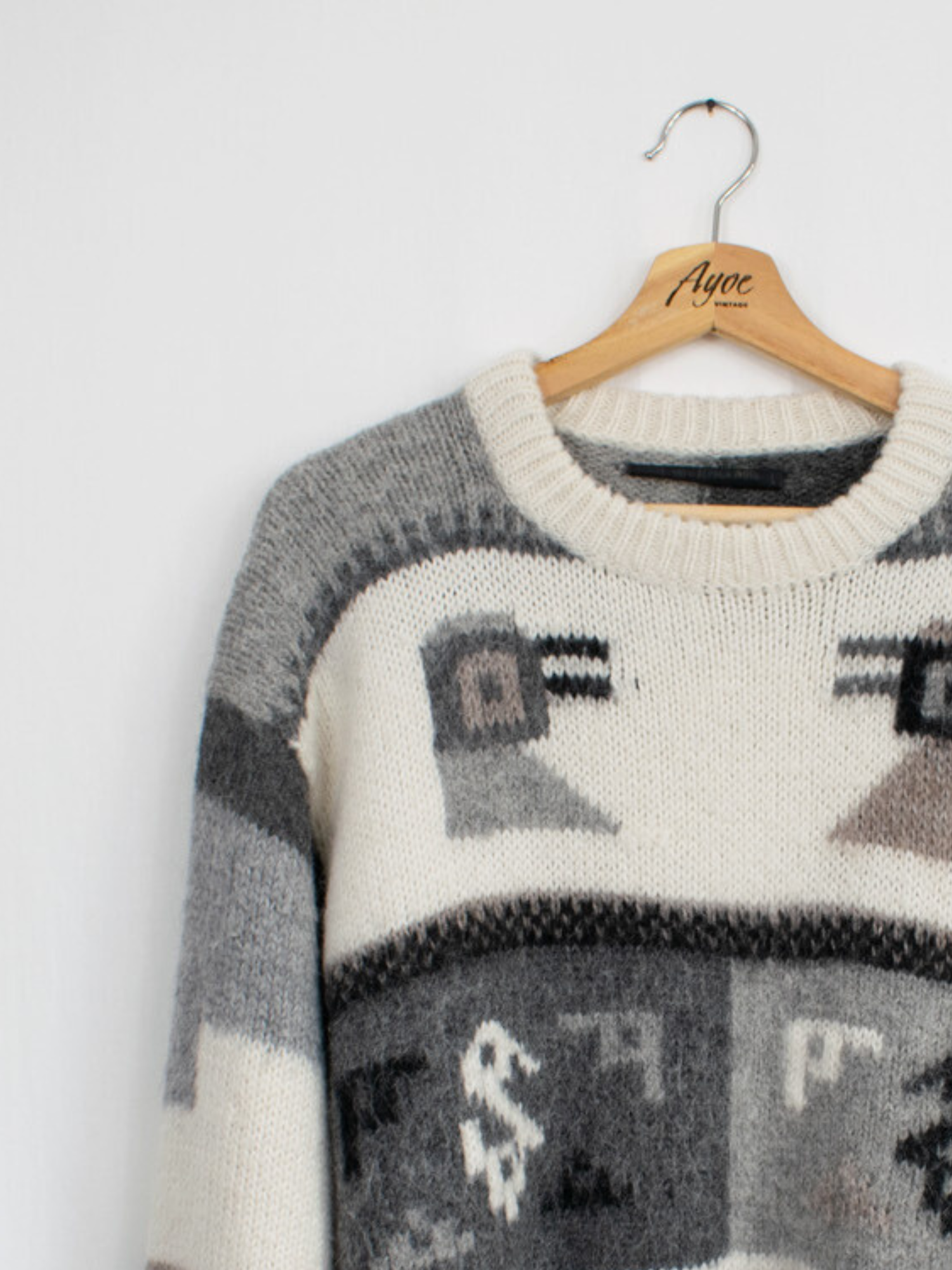 Denne fine strik sweater er med langt ærme, den har smukke detaljer og er i fine efterårsfarver - Knækket hvid, sort, brun og grå. Den er håndstrikket med teknikken Intarsia strik.