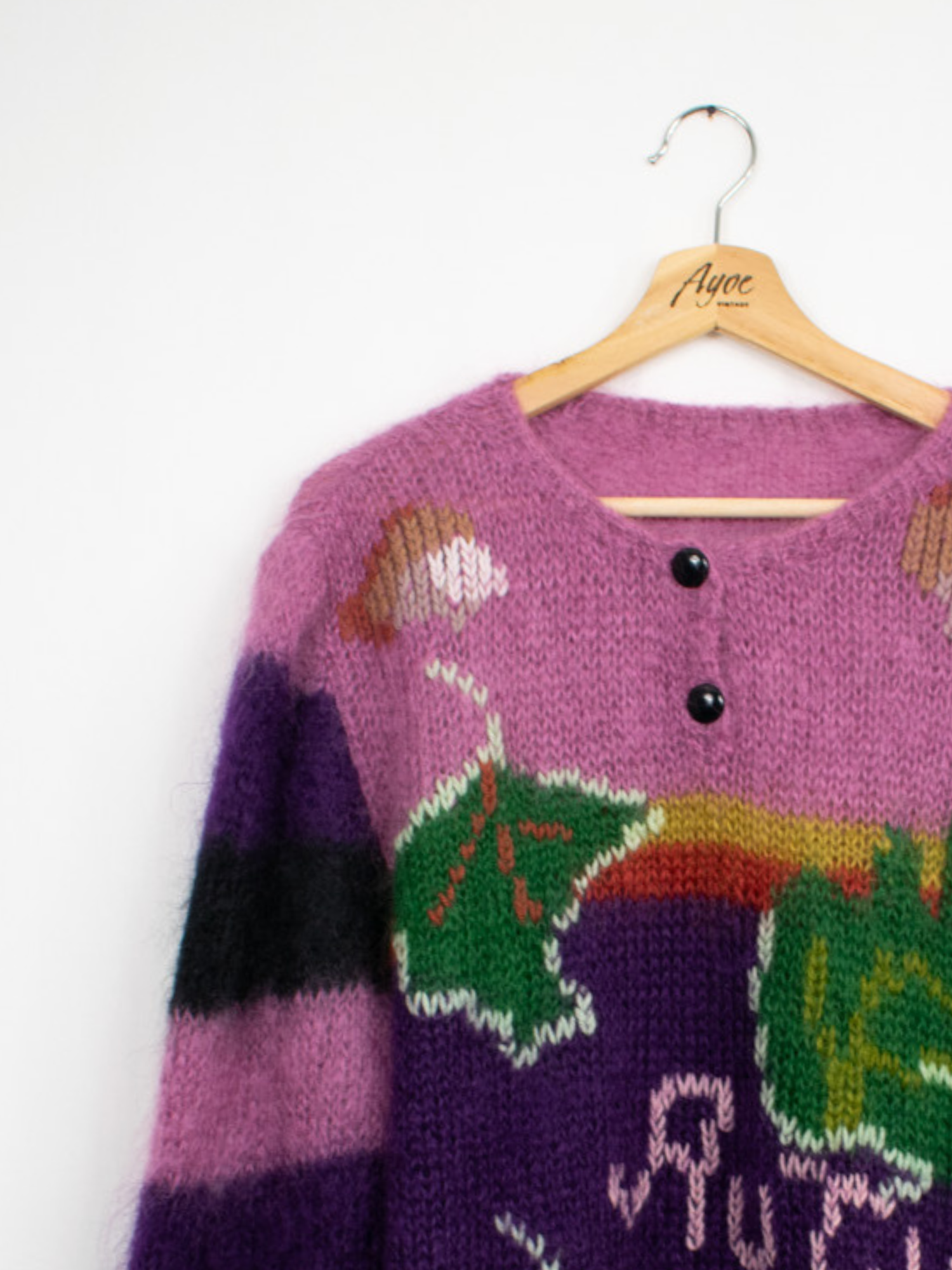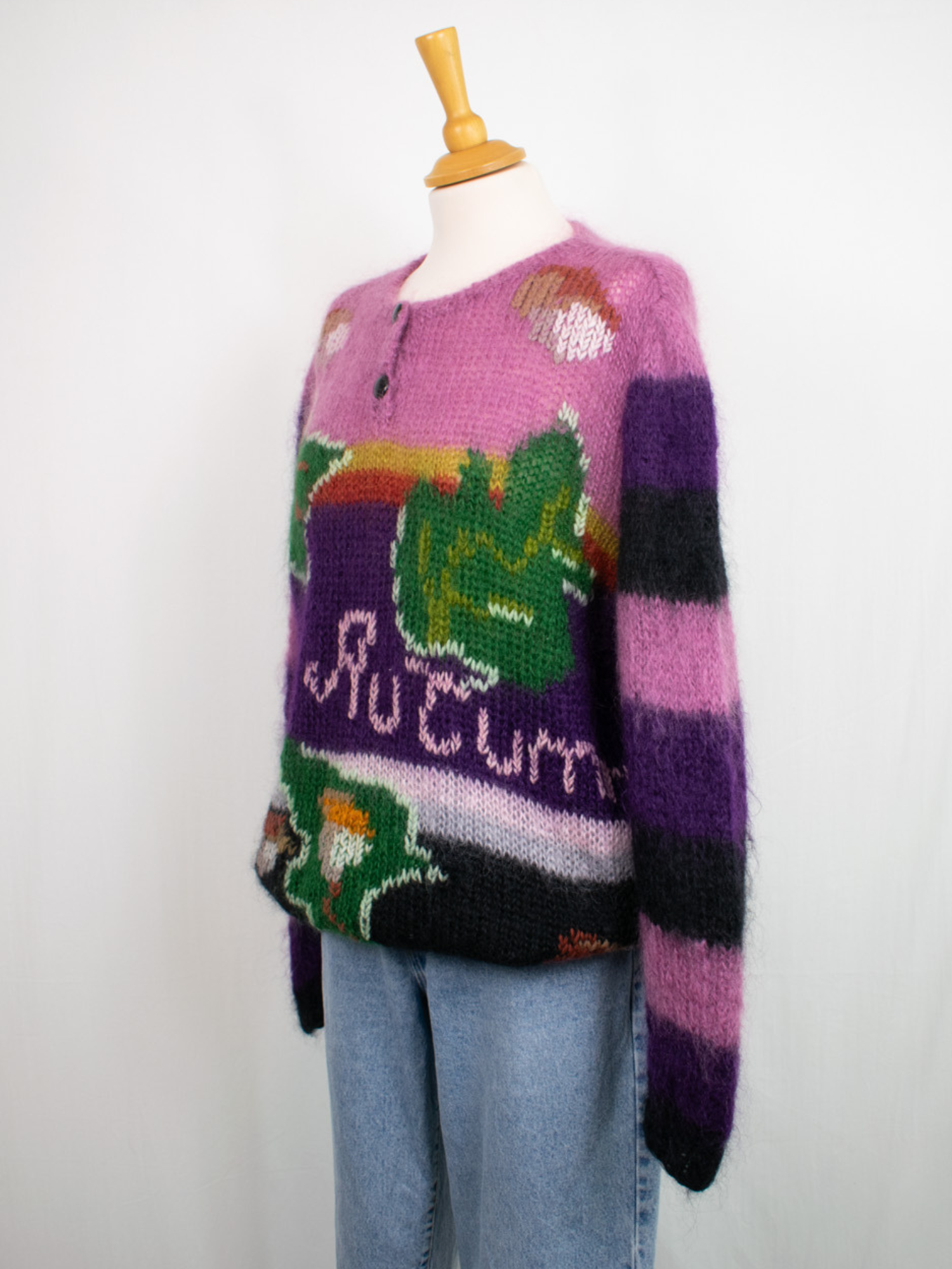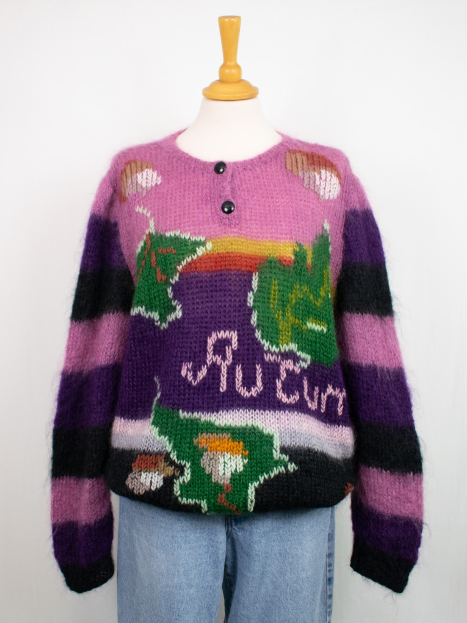 Denne fine strik sweater er med langt ærme, den har smukke detaljer og er i fine farver - teknik i strik er intarsia strik.