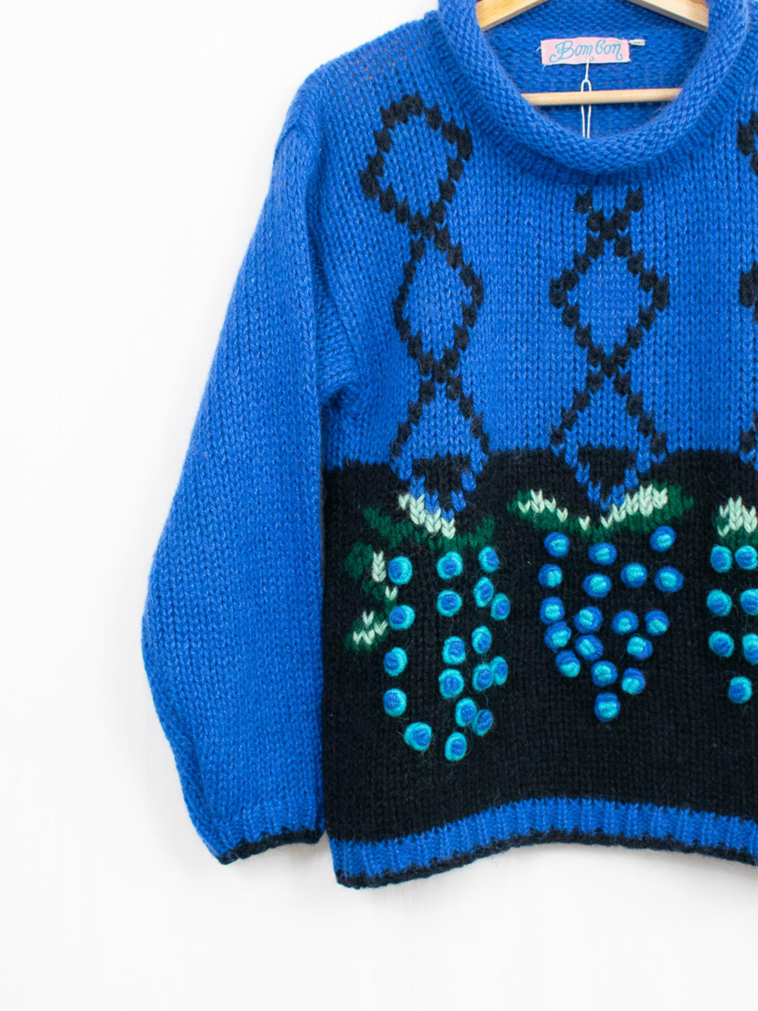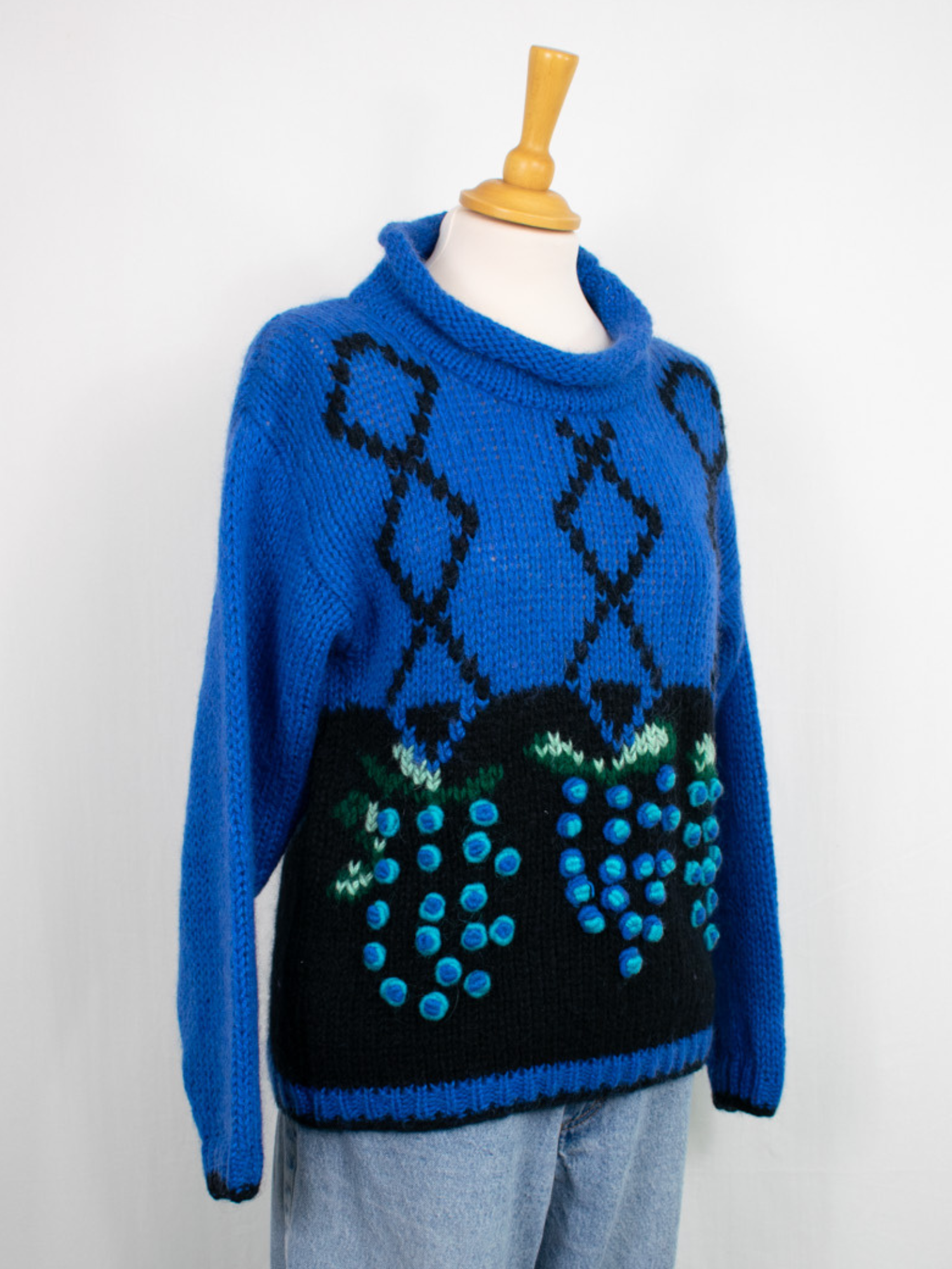 Denne fine strik sweater er med langt ærme, den har smukke detaljer og er i fine blå, sorte og grønne farver.